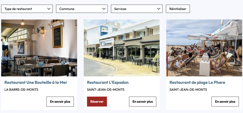 Pop-in et détails : en cliquant sur un élément, une pop-in s’ouvre avec toutes les informations détaillées et un bouton “Réserver” si applicable.
